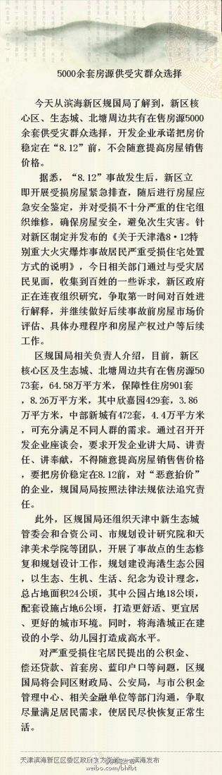 据天津市滨海新区政府官方微博“滨海发布”消息,30日从滨海新区规国局了解到,新区核心区、生态城、北塘周边共有在售房源5000余套供受灾群众选择,开发企业承诺把房价稳定在“8.12”前,不会随意提高房屋销售价格。
