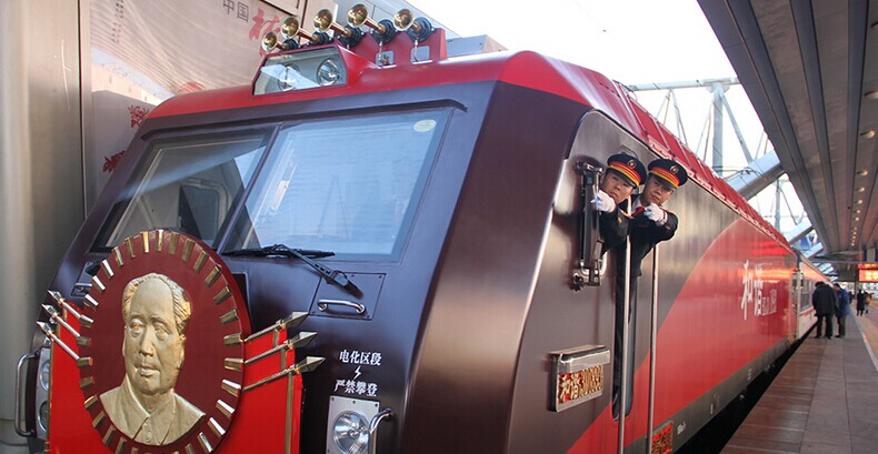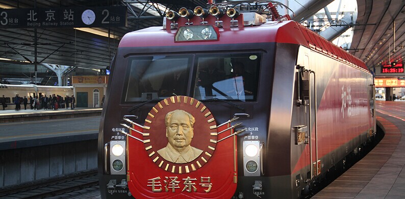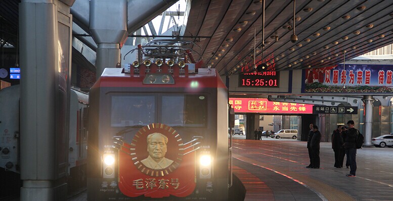 2014年12月25日 北京站 25日下午换型后的“毛泽东号”机车牵引T1次列车驶出北京站。当日,第五次换型后的“毛泽东号”机车正式投入运行,牵引T1次列车由北京站始发,将于12月26日毛泽东诞辰121周年纪念日当天早晨抵达终点站长沙站。 “毛泽东号”机车诞生于1946年10月,现隶属于北京铁路局丰台机务段。68年来,从最初的蒸汽机车到内燃机车,再到此次换型后的和谐3D型大功率电力机车,“毛泽东号”见证了中国铁路的发展与进步,更创造了累计安全行驶963万公里的业绩,被誉为“火车头中的火车头”。