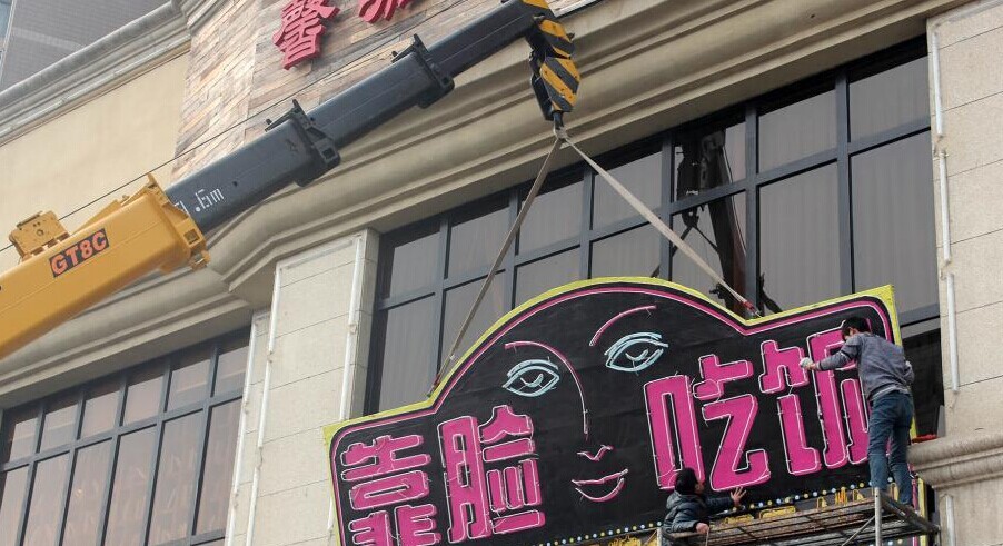 近日,郑州一餐厅因高调打出“靠脸吃饭”招牌,整形专家现场对就餐顾客容貌打分,颜值高的顾客可免费就餐活动而走火。然而,1月13日下午,该餐厅约30平方米的“靠脸吃饭”广告牌被市城管局责令自行拆除。郑州市城市管理局下发的责令改正通知书中显示,该餐厅未经批准,擅自设置户外广告行为,违反《郑州市户外广告设置管理条例》第12条规定,有碍市容容貌。不过,餐厅薛经理表示,“脸庞”虽被摘除,但“刷脸”活动将依旧进行。图为经过一个多小时的吊车与拆卸工配合作业,约30平方米的“靠脸吃饭”招牌被全部拆除。