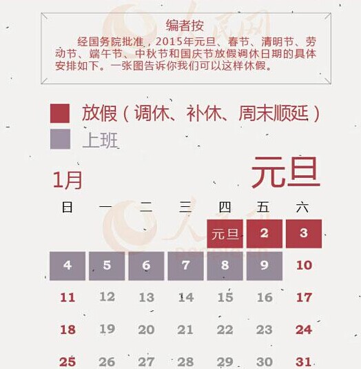 经国务院批准,现将2015年元旦、春节、清明节、劳动节、端午节、中秋节和国庆节放假调休日期的具体安排通知如下。