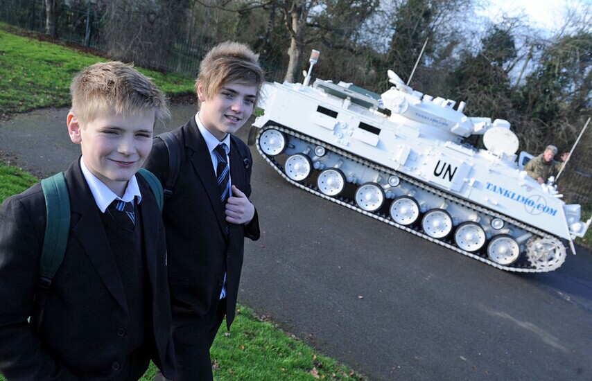 军事迷Nick Mead共拥有总计价值两百万英镑、130余辆可以合法上路的坦克,这意味着他的两个儿子每天可以自己选择一辆坦克,让父亲送他们上学。他们的座驾就算在恶劣的大雪天也丝毫不受影响。